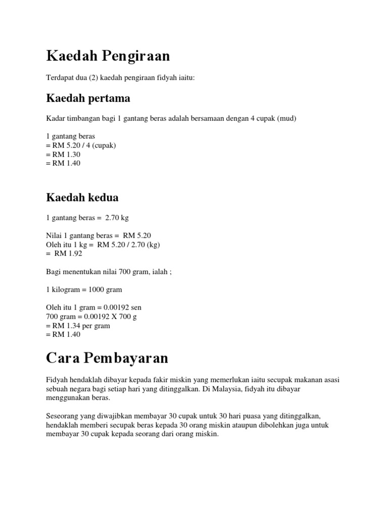 Jalinan Sutera Kadar Fidyah 1 Hari Dendanya 1 Cupak Beras 1 Cupak Beras 1 Mud 1 Mud Nilai Zakat Fitrah Semasa 4 Rm Nilai Zakat Fitrah 4